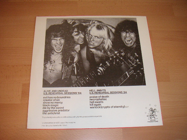 U.S.Rehearsal Sessions 1984. Doppel LP, schwarzes Vinyl (Frontcover / Backcover), mit einer Auflage von 500 Stück. Die ersten 25 Stück sollen damals mit einem T-Shirt zusammen erschienen sein (siehe Backcover). Es gibt 2 kleine Geschichten zu der Platte.... die erste Geschichte: Die Platte wurde später noch einmal rausgebracht - Auflage ? Bei der zweiten Ausgabe ist der Schriftzug "SLAYER" auf dem Frontcover aufgeklebt. Die zweite Geschichte: bei der Herstellung der Platte bzw. des Cover ist den "Herstellern" ziemlich spät aufgefallen das zwar ein Titel auf dem Frontcover ist aber keine Band, deswegen der aufgeklebte SLAYER - Schriftzug und er ist wirklich aufgeklebt ! Da die Platte trotz einer 500er Auflage relativ selten zu bekommen ist stimmt vielleicht die zweite Geschichte - oder gar keine.........