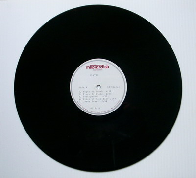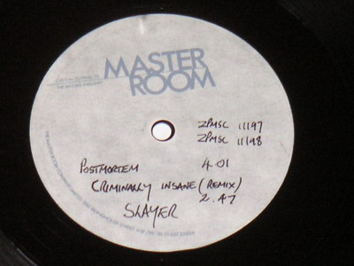 - single sided Metal Acetate (the other side is totally blank and shiny, with no grooves and no label) with two tracks: Postmortem and Criminally Insane