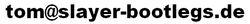 Diese Seite soll als kleiner " Leitfaden " dienen was Slayer-Bootlegs (Konzertdaten, Vinylfarben, Nachpressungen und andere Besonderheiten) angeht. Sie wird sich in erster Linie mit Vinyl-Bootlegs beschäftigen, später Erweiterung auf die Major-Records nicht ausgeschlossen (die ja weiterhin fleissig gepresst werden, in den verschiedensten Farben und Variationen, siehe farbige Show No Mercy - Reign In Blood - South Of Heaven). Habt Ihr weitere Info's, Foto's usw. bitte Mail an:
